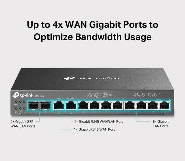 Flexible Port Configuration8× PoE+ (802.3at/af) 10/100/1000 Mbps LAN RJ45 ports providing up to 30W per port and total PoE power budget of 110W, together w/ 2 × Gigabit SFP WAN/LAN Port + 1 × Gigabit RJ45 WAN Port + 1 × Gigabit RJ45 WAN/LAN Port