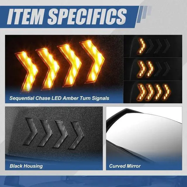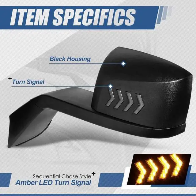 Product Specification - Housing Color: Black / Side Marker Color: Amber / Mirror Adjustment: Manual / LED Turn Signal: Yes / LED Color: Amber / LED Energy: 12V / OEM Part Number: #01610055# #01610056#