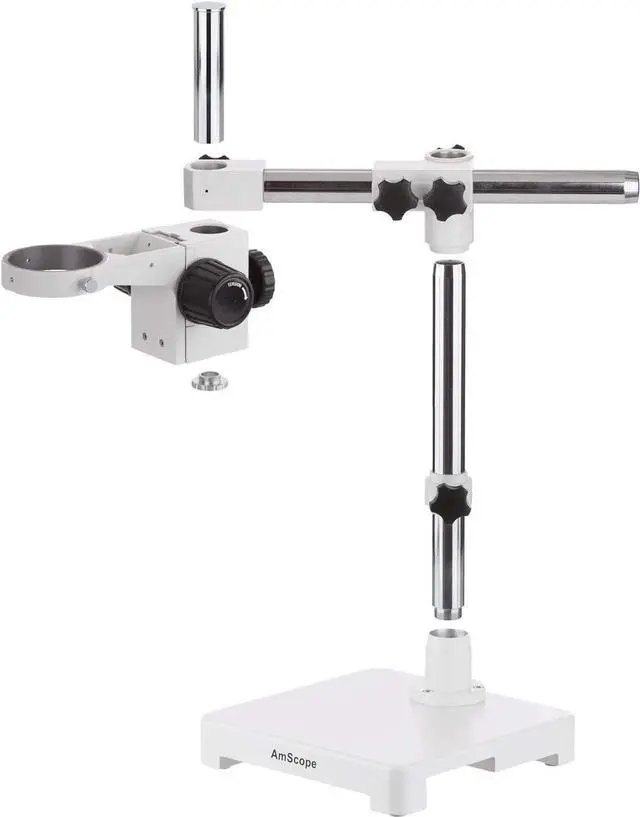This is a single-arm heavy duty boom for stereo microscopes. The diameter of the holding ring is 3" (76mm). This rugged boom stand weighs about 40 lbs. It is an ideal stand for gemologists, collectors, engravers and engineers in industries. This stand is brand new in box. Features &