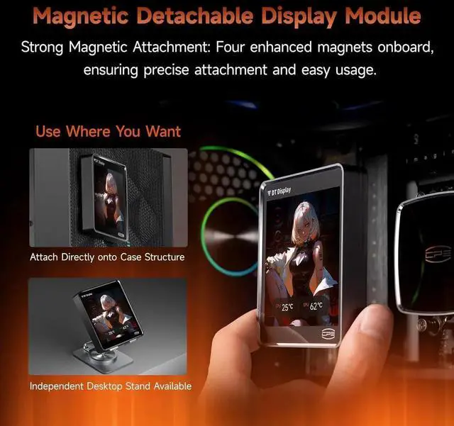 • Magnetic Detach DisplayStrong magnetic attachment, allows flexible placement on your case or independent desktop stand.