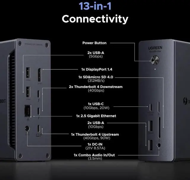 Comprehensive 13-Port Expansion: Equipped with 2 Thunderbolt 4 ports (40Gbps, 15W), 1 DisplayPort 1.4, 1x 2.5Gb Ethernet, SD/TF 4.0 card readers, 1 USB-C 3.2 (10Gbps, 20W), 2 USB-A 3.2 (10Gbps), 2 USB-A 3.0, 3.5mm audio, and 180W DC powerdelivering unmatched versatility for your workstation.