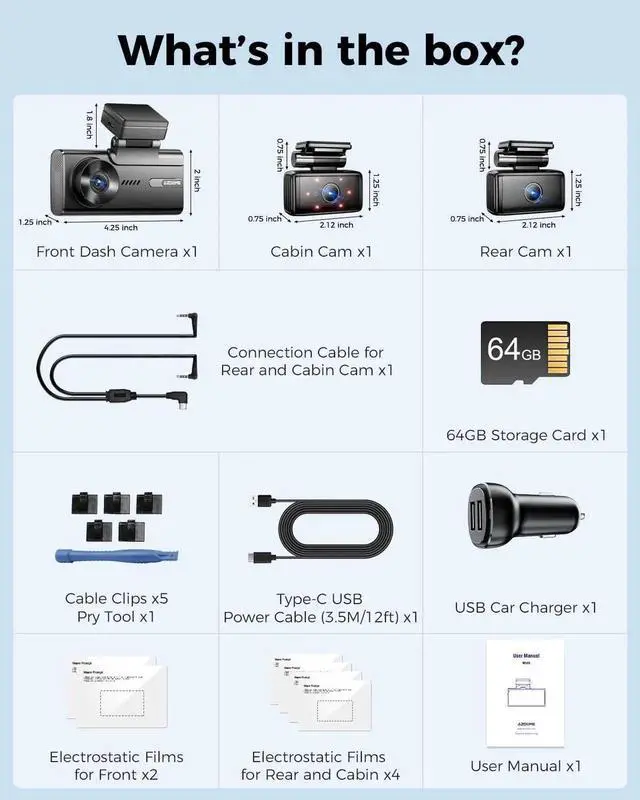 3 Channel Dash Camera for Car: 1. Front: 5K (5160x2160P); 2. Front and rear: 4K+1080P; 3. Front and inside: 4K+1080P; 4. Front and rear inside: 4K+1080P+1080P. M580 dashboard camera captures incredibly clear and detailed footage of your travels day and night.