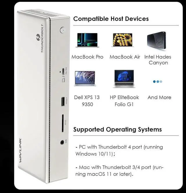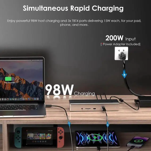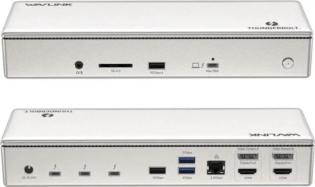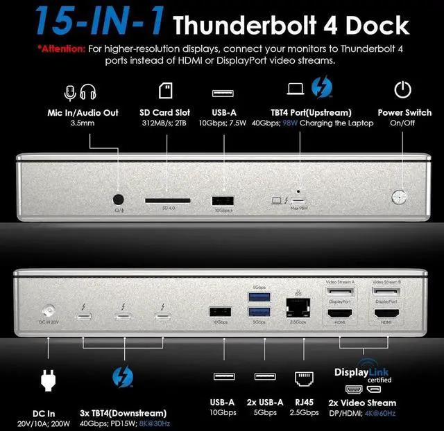 [15-in-1 Thunderbolt 4 Dock] Features a comprehensive range of ports, including 1x Upstream Thunderbolt 4 Port (40Gb/s, 98W), 1x 160W Power adapter, 3x Downstream Thunderbolt 4 Ports (40Gb/s; PD15W; 8K), 1x 2.5Gbps RJ45 Ethernet port, and 2x Video Stream (4K DP+ 4K HDMI),1x Audio, 1x SD Card Slot (312MB/s), 2x USB-A 10Gbps+2x USB-A 5Gbps. Connect all your essential peripherals with ease.