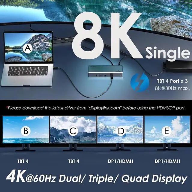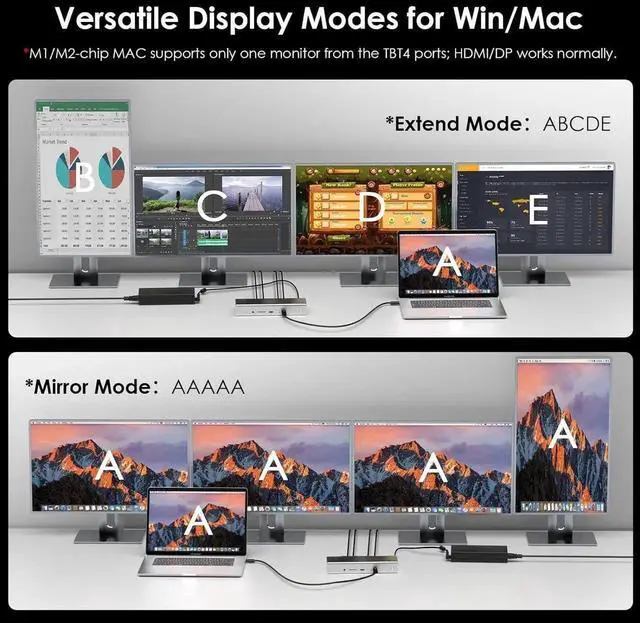 [Single 8K Display & Multiple 4K Displays] This Thunderbolt 4 dock supports an impressive single 8K display or Quad 4K displays (2x HDMI/DP + 2x Thunderbolt 4), providing stunning visuals and enhancing productivity. You can effortlessly switch between extend and mirror modes to customize your workflow. *Please note: M1/M2/M3-based Macs can only have one video output from the three Thunderbolt 4 ports, but the HDMI and DP ports function normally; HDCP like Netflix, Disney+, Hulu
