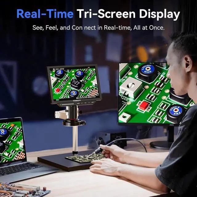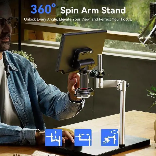 Spin Arm Digital Microscope: The Micro soldering microscope features a 360° rotating arm, offering vertical and horizontal adjustment for precise positioning; The 13-inch pillar and 3.5-inch ne-tuning stand provide ample height and stability for detailed repair work