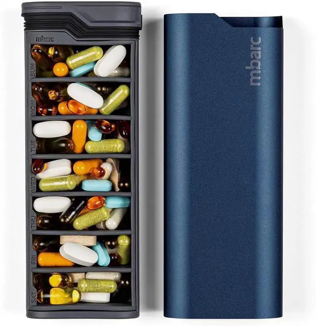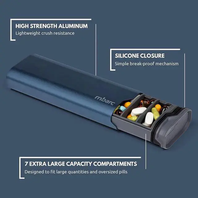 STRONG AND EASY TO USE - Securely store your largest and smallest pills in their individual 7 daily containers in this unique medicine organizer. Opens with one hand, and when it is closed, it stays closed. Extremely strong. Go ahead, drop it, stand on it, ride your bike over it. The mbarc weekly pill case will outlast any other pill holder on the market and will look great in the process.