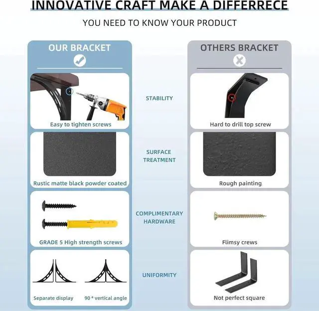 Complimentary hardwareComes with G5 high strength screws and authors, as good as your local hardware chain store. screws and anchors are for different walls. Following the steps properly, put your Pre-prepared lumber board on, you will get your perfect and st floating shelves.