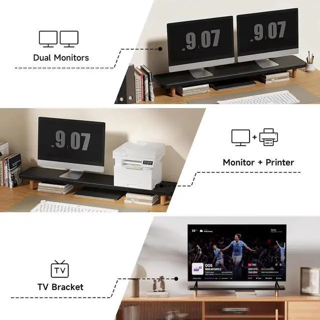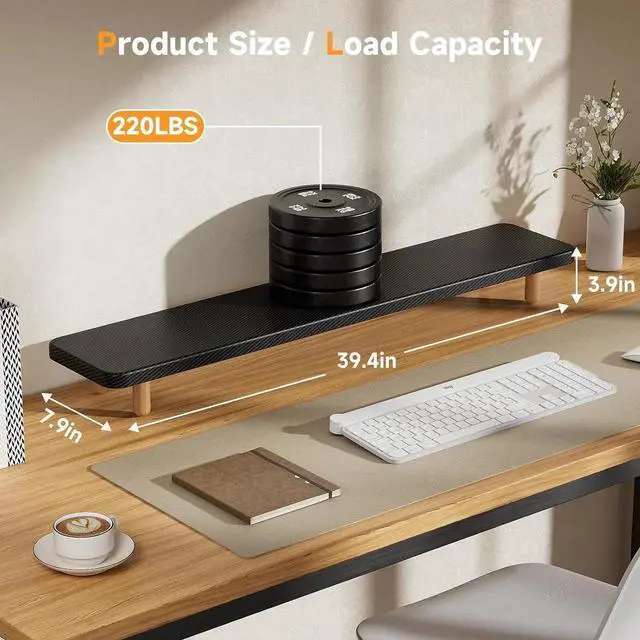 ENHANCED DUAL MONITOR STAND: This monitor stand boasts dimensions of 39.4" L x 7.9" W x 3.9" H, featuring an extended panel designed to comfortably accommodate two monitors or laptops. It seamlessly adapts to your multi-screen work environment, ensuring a broader viewport and heightened productivity.