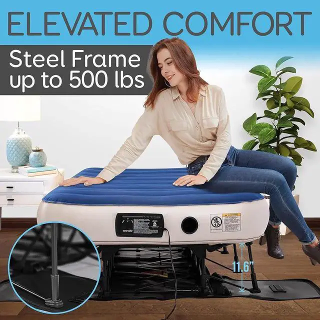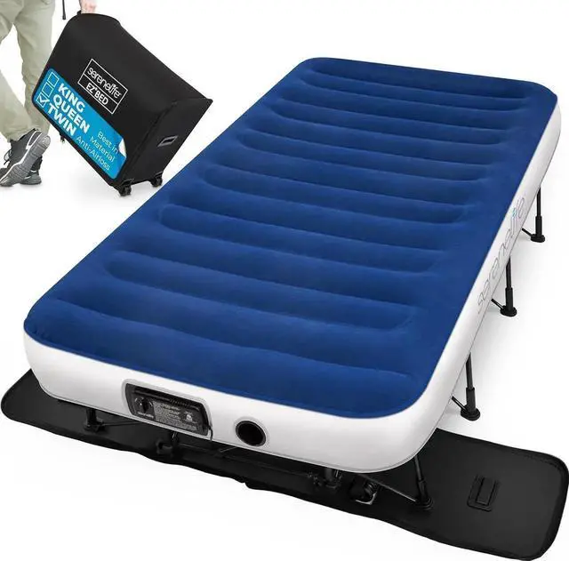 TWIN SIZED EZ-BED: Self inflating air mattress is 77 x 40 x 20.25 when inflated, this twin sized inflatable blowup mattress with frame unfolds automatically to accommodate guests with luxury sleep during their travelfalseSOFT FLOCKED TOP SURFACE: Blow up mattress with frame features a soft, plush, and flocked top surface, this airbed will be absolutely cozy to your body. It will prevent sheets from sliding, keeping it in place for better convenience when sleepingfalse3 MINUTES INFLATE / DEFLATE: Instant guest bed with stand features a built in high output electric power pump, inflate or deflate in just 3 minutes. Roll away bed furniture includes 2 repair patches with adhesive for simply repairfalse