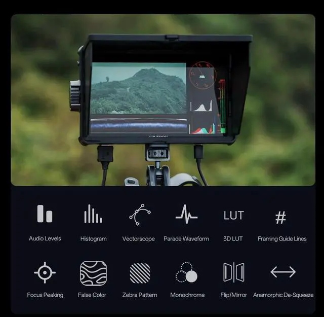 Professional Monitoring Software-3D LUTDC-A1 has rich monitoring functions,import 3D LUT through the SD card,help the photographer achieve a variety of creative effects in the post editing.In addition,it also has Parade waveform,vectorgraph,brightness histogram,auxiliary focus,audio column,image flip,false color,etc