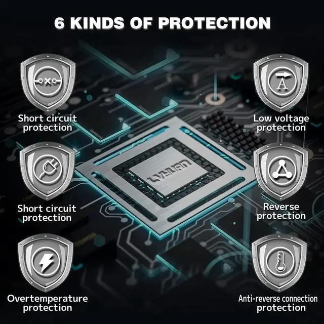 - ADVANCED PROTECTION: Six safety protection modes including over-voltage, under-voltage, overload, over-temperature, short circuit, and reverse polarity protection.