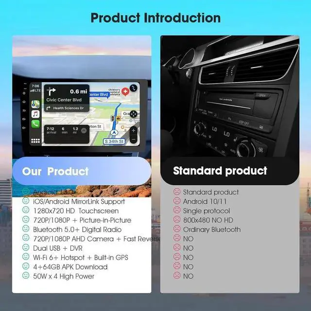 Dual USB & Advanced DVR IntegrationDual USB ports enable CarPlay charging while supporting USB DVR playback, dash cam previews, and real-time recording via 720/1080P AHD cameras, including quick-reverse assist. falsePowerful 50W x 4 Output & GPS PrecisionDelivers robust sound for CarPlay entertainment, while built-in GPS and network hotspot support ensure accurate, real-time navigation overlays and traffic updates. Stay connected with Bluetooth 5.0 for hands-free calls, music sharing, and internet tethering, false- Seamless CarPlay & MirrorLink ConnectivityEnjoy effortless integration with CarPlay and Android/iOS MirrorLink, ensuring smooth smartphone mirroring for navigation, calls, and app control on the 1280x720P HD capacitive touchscreen.