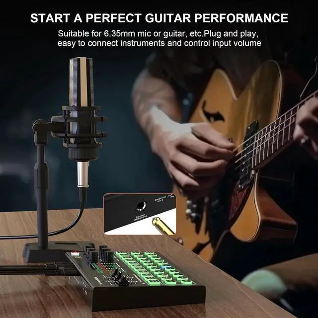 - Instruments Accompaniment: Perfect for guitar, bass, and other musical instruments direct input via a 6.35 mm or 3.5 mm port. So you can go on your online live streaming, audio production, or radio show, directly input the audio from musical instruments, no need to input instruments audio through the mic, no need to sacrifice the instrument sound quality. Go perfect Broadcast mix with your electric guitar