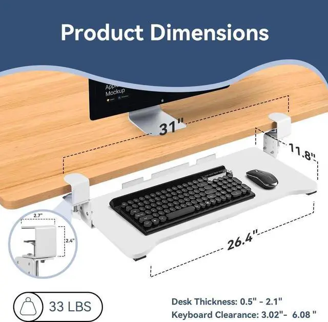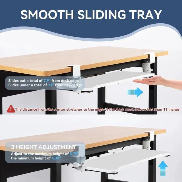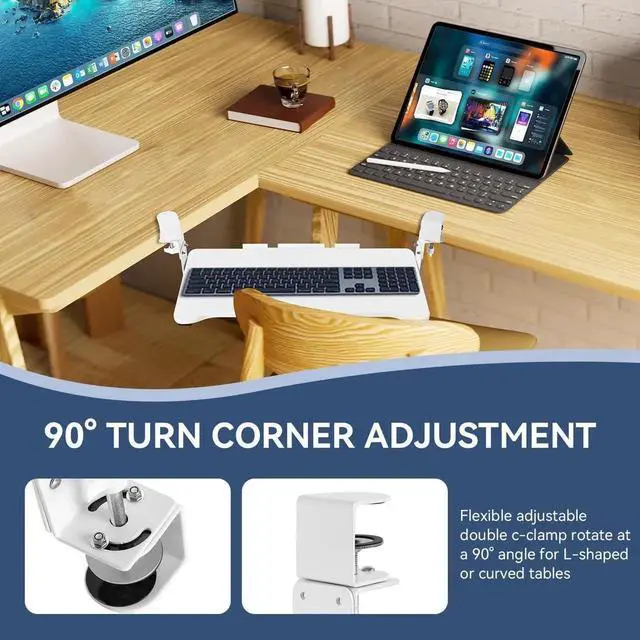 QUICK & EASY INSTALLATIONSetting up is a breeze! Our under desk keyboard tray slide out tray comes with all the necessary hardware and clear instructions for a hassle-free installation. The adjustable C-clamps fit desks 0.5" up to 2.1" thick, ensuring a secure and damage-free setup