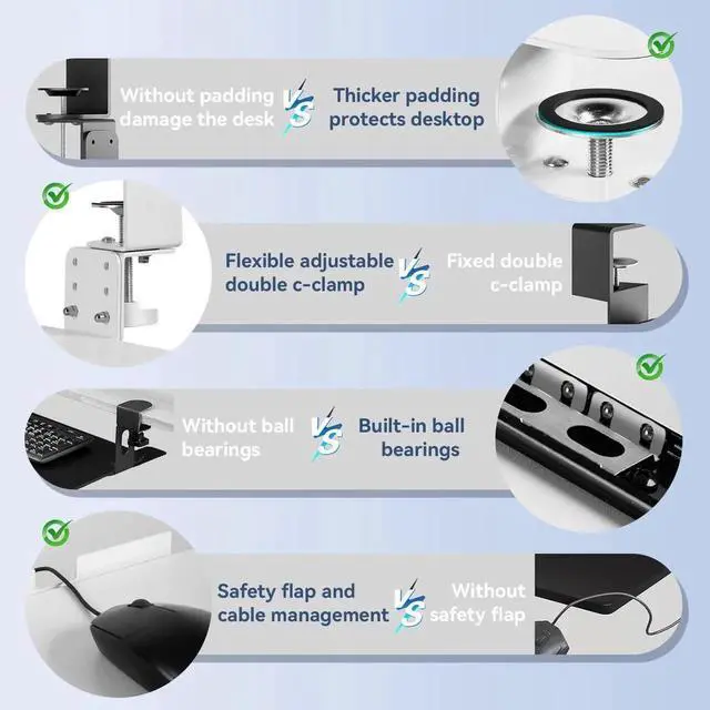 SMOOTH GLIDE & ROCK-SOLID STABILITYBuilt with premium ball bearings, our tray glides effortlessly and quietly. The heavy-duty steel brackets and non-slip pads ensure maximum stability, supporting up to 33 lbs. Plus, the safety flap and cable management system keep your workspace organized and secure