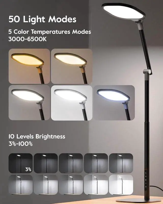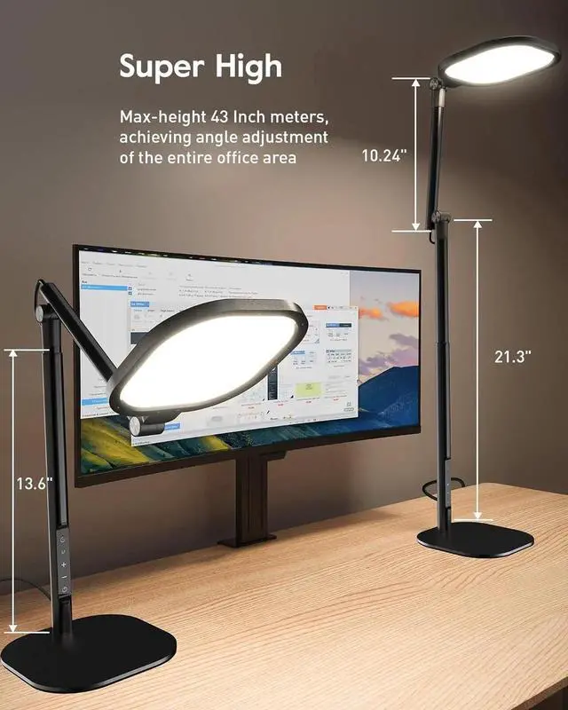 43-Inch Extra-High Desk Lamp Illuminate your entire workspace with ease. Adjustable height, bright glare-free lighting, and flexible settings for home office, video calls, and more. Ultimate Flexibility & Perfect Light Control Adjust brightness from 3% to 100% and color temperature between 2700K and 6500K. Multiple flexible joints let you position this led desk lamp with base exactly where you wanttailored lighting for every moment. Soothing Glow & Effortless SetupSoft Yet Powerful LightingEdge-Lit Full-Screen illumination design delivers wide, bright light thats soft and glare-freeeasy on the eyes even during long hours.
