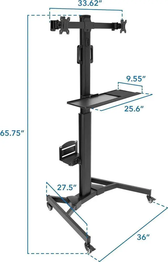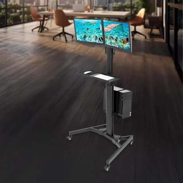 Standing Dual Monitor Workstation on Wheels Designed for users who need a mobile, space-efficient setup with two monitors, this rolling workstation is perfect for offices, hospitals, classrooms, warehouses, and manufacturing floors where flexibility and quick relocation are essential.