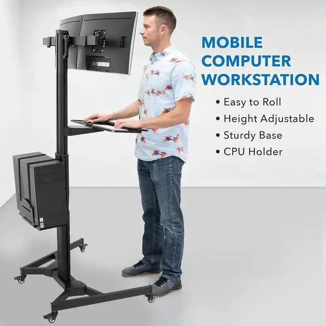 Dual Monitor Computer Cart Mobile Standing Desk with Wheels, Rolling Workstation with Keyboard Tray, CPU Holder, and Adjustable Screen Mount for Office, Medical, or Warehouse