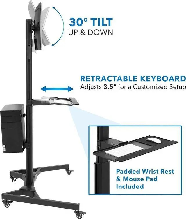 Ergonomic Height Adjustment for Productivity Independent height adjustment for the keyboard tray and dual monitor mount ensures optimal posture whether youre seated or standing. Perfect for medical rounds, lab work, or warehouse supervisors reviewing data on the move.