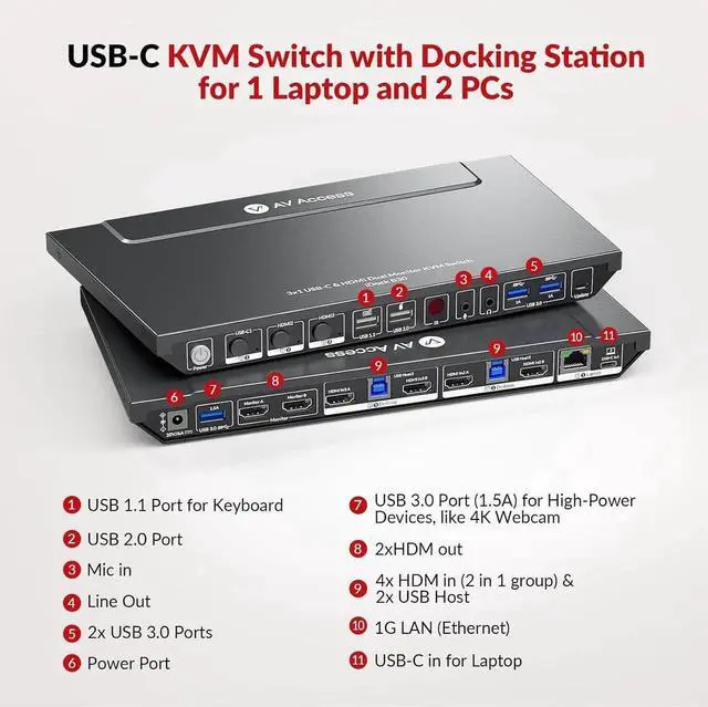 AV Access KVM Switch Dock for a Laptop and 2 Desktop PCs, Dual 4K Monitor USB C Docking Station, Type-C 65W Charging for Laptop, Ethernet, EDID, Hotkey Switch, HDMI, 4K@60Hz, 1080P@240Hz, USB 3.0