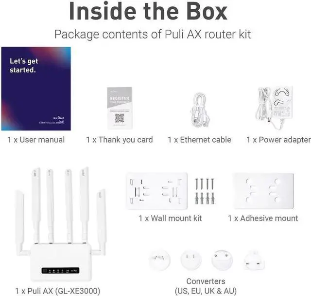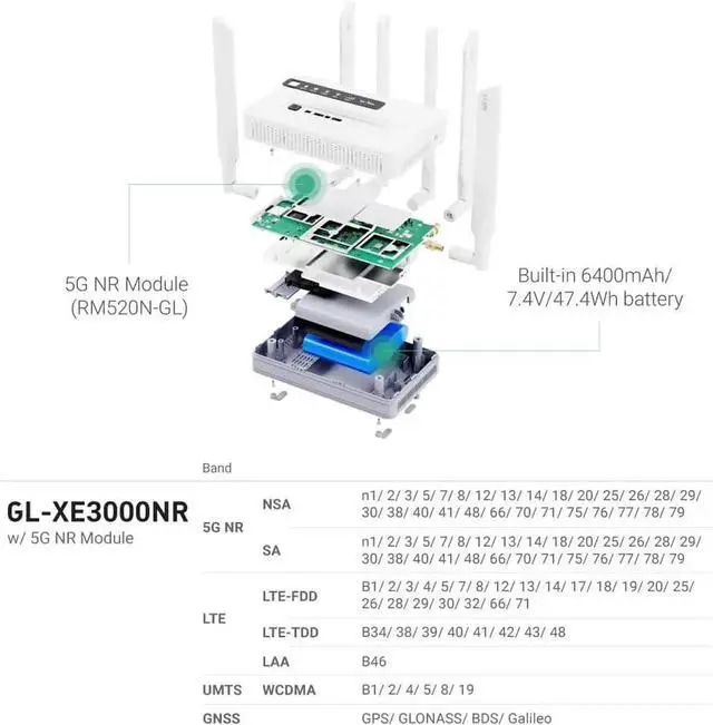 Fast Wi-Fi 6 Cellular RouterGL-XE3000 provides reli cellular networks for remote access and high speed internet in urban areas with up to 574Mbps (2.4GHz) + 2402Mbps (5GHz) Wi-Fi speeds. Supports MU-MIMO technology for simultaneous wireless network connections in different scenarios. *Speed Tests conducted on a local network. Real world speeds may differ depending on your network configuration.
