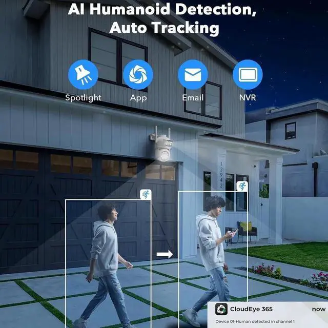 2K & Smart Night VisionThis wireless security camera system is equipped with smart, full colour and infrared night vision, the unique smart night vision will automatically switch the screen from B/W to full colour when detecting moving objects, reducing power consumption by 45% compared to traditional night vision. Equipped with 2K resolution, this surveillance camera can capture clear images even in low-light environment, no thief can hide.Perfect FunctionCAMCAMP nvr security camera system is also features with auto human tracking, human detection, sound and light alarms, APP push, IP66 weatherproof function for both indoor and outdoor use, it is an ideal choice for home, supermarket, garage, warehouse, office and car parking security monitoring.