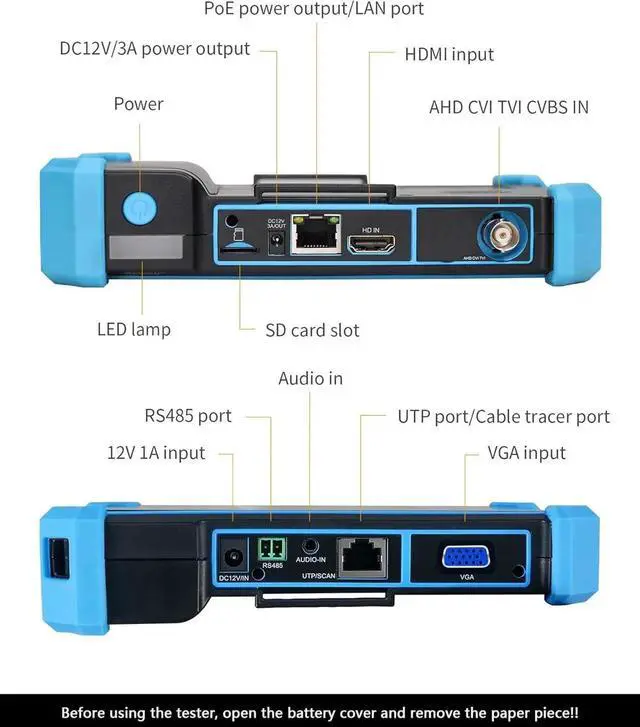 [ IP Analog Camera Tester ] 5.4'' IPS touch screen,IP Discovery/Quick ONVF/IPC test /RTSP play /Client APK.Auto view the video, create testing report.Support batch activate Hik and DH cameras and modify IP address, modify password etc. Self-defined modify channel name. Supports CVBS analog camera test.1 channel BNC input, NTSC/PAL (Auto adapt); PTZ control, RS485 control, Baud 600-115200bps, compatible with more than 30 protocols