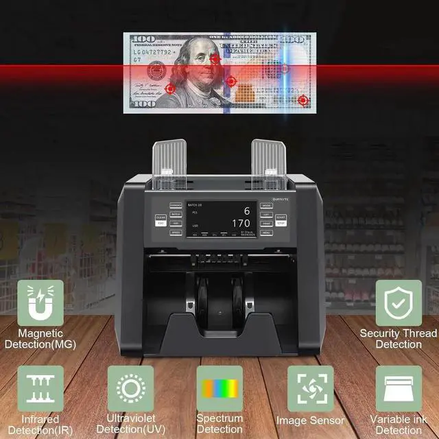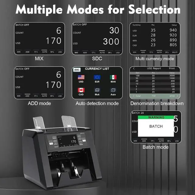 Multi Curren&Multiple Working Modes: Designed for North American market and supports multi-curren value counting(USD/EUR/MXN/CAD). Works under different counting modes to meet your demand: SORT, MIX, Auto curren detect, Multi Curren Mix Count, ADD & BATCH. Ideal for small business, gas station, stores, restaurants.