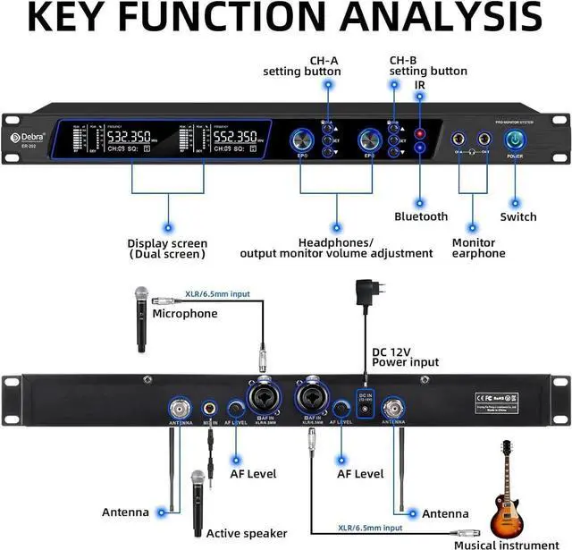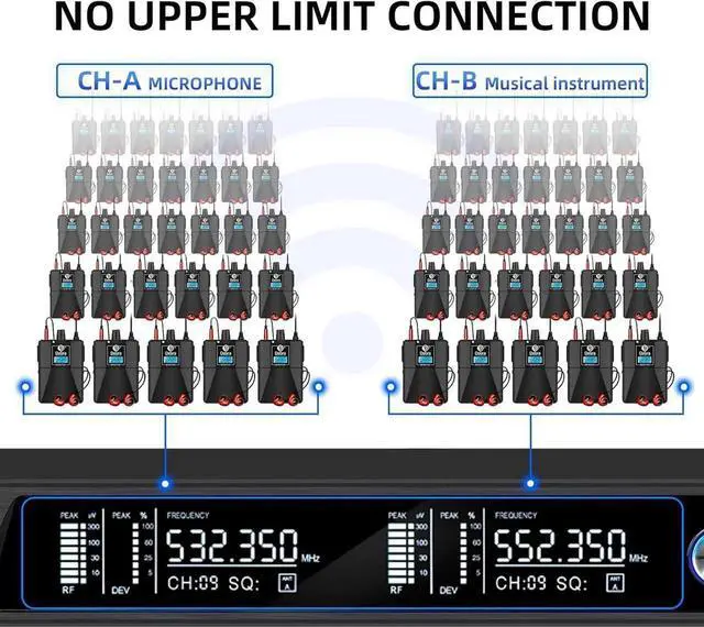 The PRO UHF Mono Wireless In Ear Monitoring System: D Debra audio's new UHF system with phase-locked loop PLL. It using high-quality IC chips, improves the overall performance, anti-frequency reduction, anti-series frequency, has a stronger and more stable signal, better signal to noise ratio. The frequency range is 510 MHz-580 MHz. The preset 100 frequencies for each channel can be switched at will, which can better avoid signal interference.falseSuitable For Multiple Places: Built-in limiter circuitry eliminating distortion under excessive input levels. Front panel 1/4-inch monitoring has the headphone jack. Back panel have 6.35 mixed input and two channel independent integrated interface input. Good used in stage, broadcast, recording studio, musicians, band performance.falseFeature Design: The transmitter has LCD display panel, RF and AF display. The receiver is equipped with LCD display, power supply and RF receiving indicator. The panel can monitor battery power.false