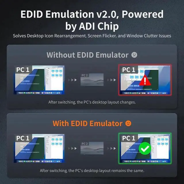 EDID Emulators for Display StabilityEDID emulators keep your resolution and screen settings intact when switching between PCs. No more screen flicker or layout resets