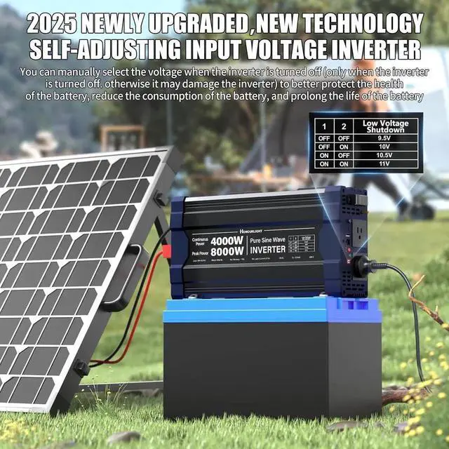 2025 NEWLY UPGRADED, NEW TECHNOLOGY, SELF-ADJUSTING INPUT VOLTAGE INVERTERYou can manually select the voltage when the inverter is turned off (9.5V-11V)(only when the inverter is turned off, otherwise it may damage the inverter) to better protect the health of the battery, reduce the consumption of the battery, and prolong the life of the battery