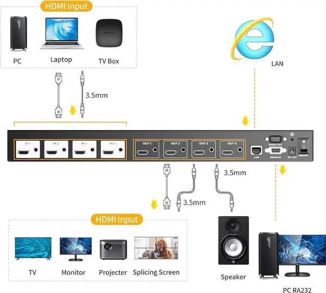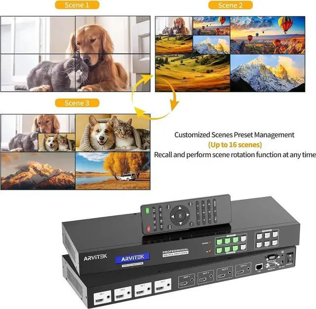 Work as HDMI MultiviewerOnly OUTPUT 1 supports split function. There are 23 kinds of split modes, such as PIP/POP/Quad-view, and more. Only work for output 1 in split single screen mode support 0°, 90°,180°,270°rotation. Resolution up to 1080P, 720P. If you want to rotate other input, please set the input to output 1 in split single screen mode firstl