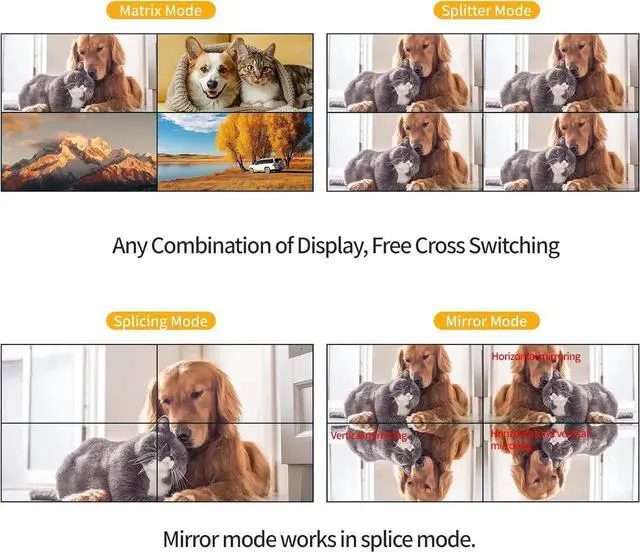 Work as Video wall controller 2x2 MatrixSupport multiple splicing modes: 2x2/2X1/3X1/4X1/1X2/1X3/1X4. There are 4 Mirror modes in splicing mode: No Mirror, Horizontal Mirror, Vertical Mirror, Horizontal Vertical Mirror. Resolution up to 1080P in splicing mode.
