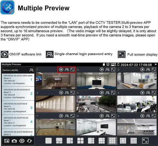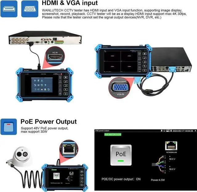 [ TVI CVI AHD SDI Camera Tester ] CCTV monitor tester supports 8MP TVI / CVI / AHD / SDI camera testing and UTC control, and supports calling OSD menu. Auto HD -recognize the resolution and image display of Analog and HD cameras. Support coaxial PTZ and call OSD menu. Support CVBS and 8MP TVI/CVI/AHD cameras. Select relative function on the right side toolbar to operate, functions including ''Photos'', ''Snapshot'', ''Record'', ''Playback'', ''PTZ'', ''Set''. Multiple preview APP supports synchronized preview of multiple cameras, playback of the camera 2 to 3 frames per second, up to 32 simultaneous preview