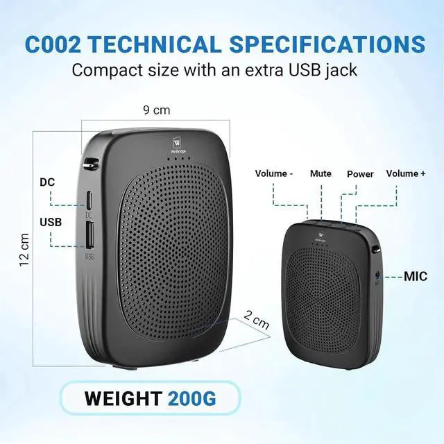 Speaker: The C002 Bluetooth Voice Amplifier is a powerful teaching assistant! With a robust 15W output, it delivers clear and loud sound, easily covering up to 10, 000 square feet. Whether in a classroom of 50-75 students, every corner will be filled with clear audio. Say goodbye to straining your voice and hello to focused teaching, making knowledge delivery more efficient and the classroom atmosphere more engaging.