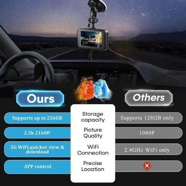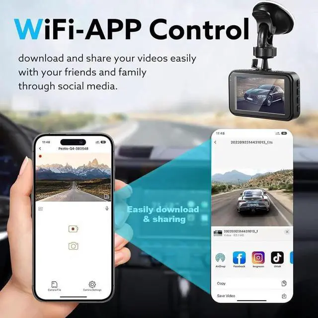 Wireless WiFi Control: The dash cam for Cars has built-in Dual-Band WiFi ( 2.4GH z and 5.0GH z), Both Android and IOS users can connect to dashcam WiFi via the app. you can quickly view your recorded videos and share your driving experiences in real-time on your smartphone