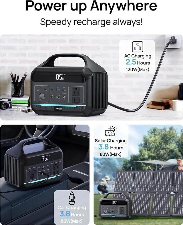 ULTRA-FAST RECHARGING & MULTIPLE OPTIONS Recharges to 80% in just 2 hours via AC cable, or faster with solar + AC combo; supports car charging and solar input for versatile on-the-go power(Does not include car charging cable and solar panel).