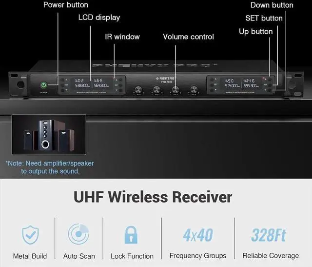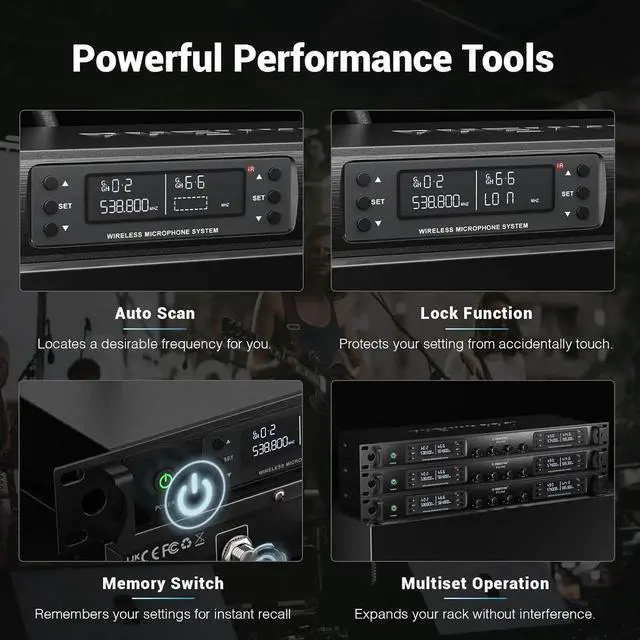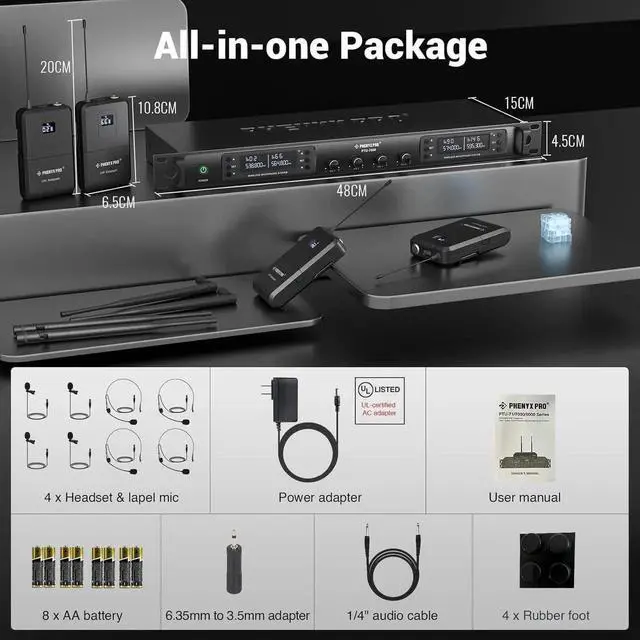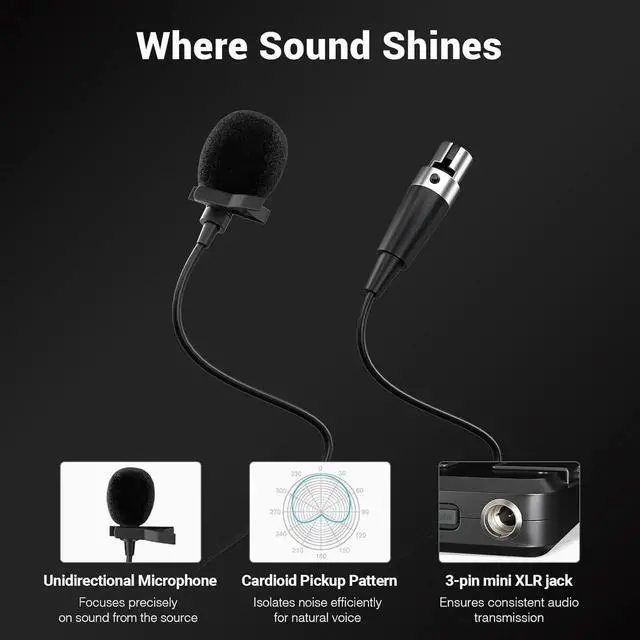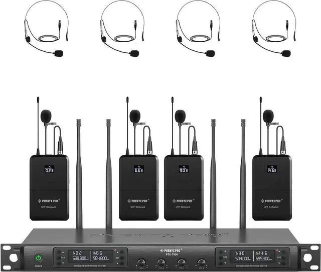 ENHANCED SIGNAL RELIABILITY: Advanced Auto-Scan function enables the wireless headset lapel microphone system to rapidly identify interference-free frequency to sync, increasing anti-interference ability of the microfonos inalambrico. No dropout or hissfalsePREMIUM WIRELESS PERFORMANCE: Quad UHF cordless mic system with 4x40 selectable frequencies delivers ultra-long stable range of 290 ft 328 ft line of sight. The UHF wireless microphone & system pair up receiver and cordless mics smoothly within secondsfalseREFINED SOUND CLARITY: Featuring unidirectional lapel and headset microphones that precisely capture sound from the intended direction, effectively rejecting ambient noise. High-quality dynamic mic capsule renders exceptional clear and crisp audio qualityfalse