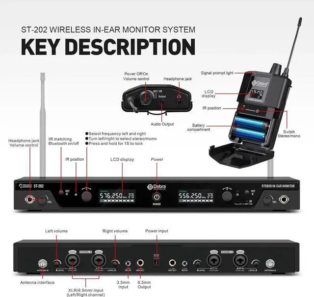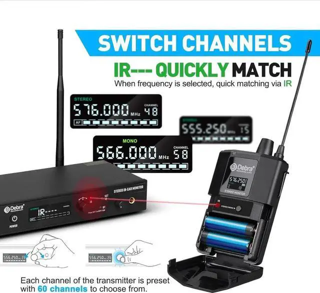 WIRELESS PERFORMANCEUHF band phase-locked PLL, in the 560-590Mhz band, preset 60 frequencies can be switched at will. UHF transmission with a range of 80 meters and up to 300 meters in open environments. Simultaneously improves the signal-to-noise ratio in the dynamic range, gives the system optimum immunity to interference and ensures perfect acoustic soundPOWERFUL AUDIO SEPARATIONThe stereo monitor headset has excellent audio separation, which can clearly distinguish the position and direction of different sound sources. When you use this headset for gaming or watching movies, you will be able to accurately locate enemies in the game or sound effects in the movie, enhancing your gaming competitiveness and movie watching experience