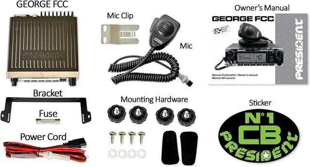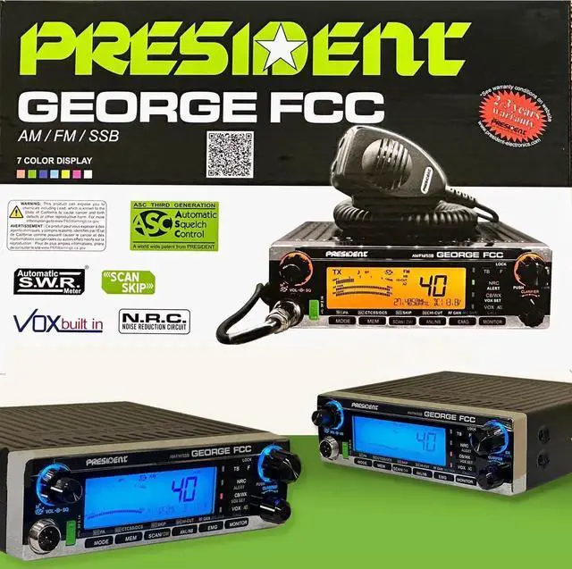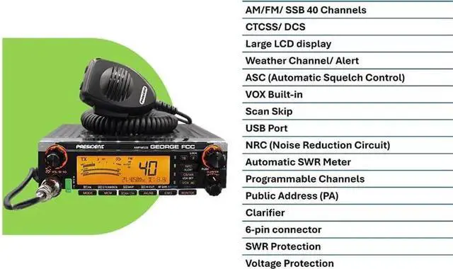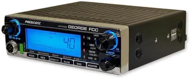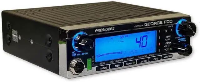 George FCC AM/FM/SSB CB Radio, CTCSS/DCS, Large 7 Color LCD Display, Weather Channel/Alert, ASC, VOX, Scan Skip, USB Port, NRC, Automatic SWR, PA, SWR and Voltage Protection