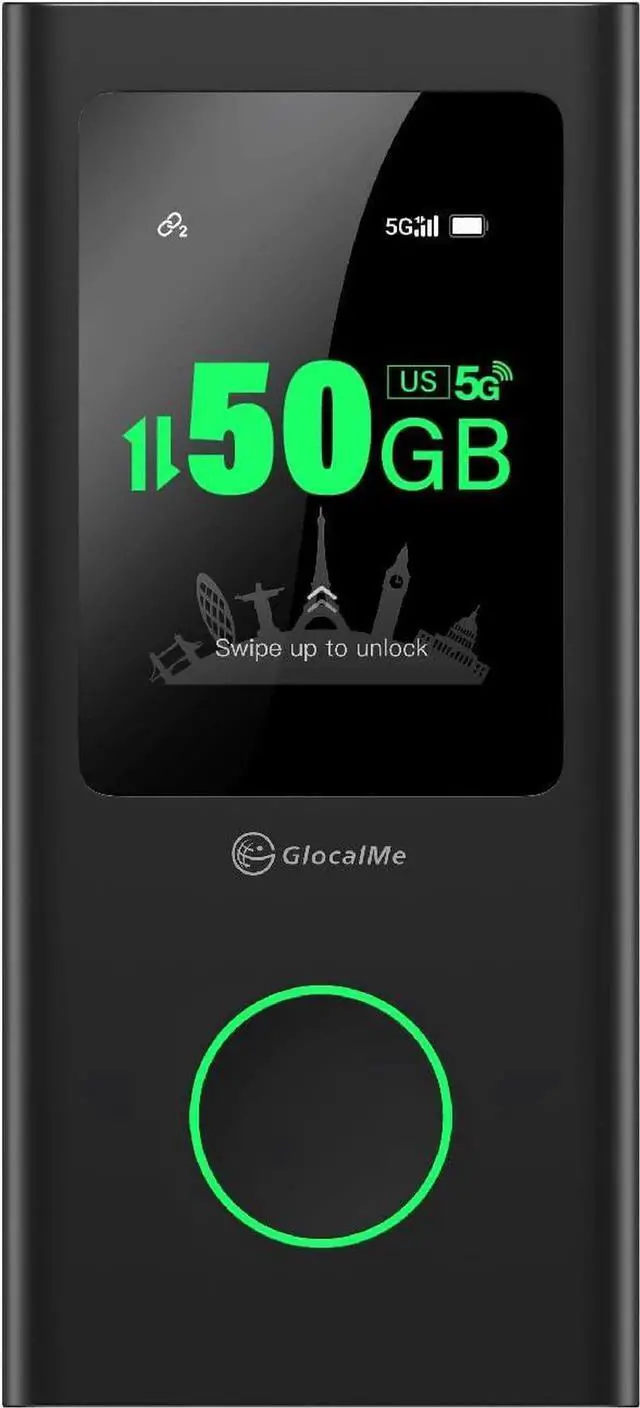 Preloaded 50GB US/CA/MX Data: Preloaded with 50GB data for America/Canada/Mexico, valid for 90 days. Ready to use out of the box with no additional data purchase required. Download the GlocalMe APP, register, and receive extra data for high speed connectivity on-the-go. Stay connected effortlessly with Numen Air 5G mobile hotspot!falseLightning-fast Internet Speeds: The GlocalMe Numen Air 5G portable WiFi hotspot boasts the fastest internet speed available worldwide, with speeds up to 2.5 Gbps that's 15 times faster than 4G! Say goodbye to interruptions and lags for seamless browsing, streaming and downloading.falseGlobal Frequency Bands: With support for more than 80 commercialized 5G countries and over 350 operator networks, this portable WiFi hotspot device has you covered almost anywhere in the world. It also supports both 2.4GHz & 5GHz bands, providing greater flexibility in network management and minimizing interference in congested environments.false