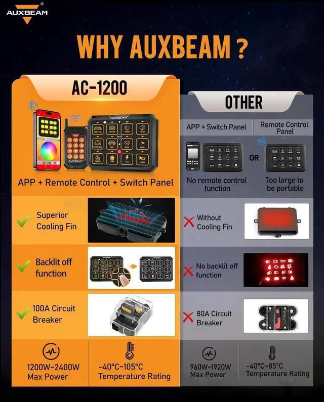 Wireless Remote ControlAC-1200 12 gang switch panel includes a remote control, allowing you to access the accessories whether you are inside or outside the car. The remote control easily adheres to metal surfaces for quick access. It comes with pre-installed batteries for instant operation.