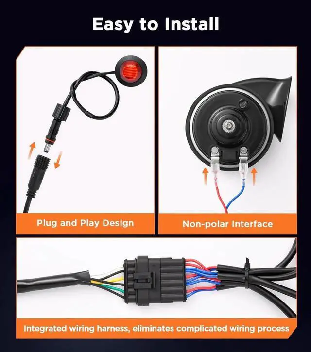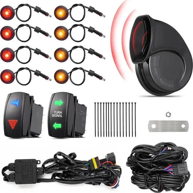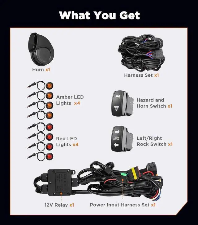 Package IncludedThe kit contains all necessary accessories including amber turn signal lights x4, red turn signal x4, 110db horn x1, left/right rocker switch x1, horn switch x1, wiring harness set x1, relay x1, nylon cable tie set x1 and installation guide x1.