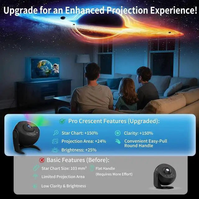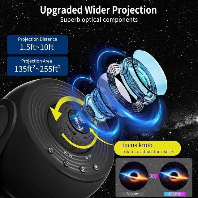 Wide Coverage &a; 360° RotationThis galaxy light projector projects vivid stars and solar system images onto walls, floors, and ceilings, with a maximum projection distance of up to 16.4 ft (optimal distance: 9.84 ft) and a coverage area of 135-754 sq ft; it features 360° full rotation and a dedicated film disc rotation button to create an immersive cosmic atmosphere, is USB-powered for easy use in bedrooms, parties, weddings, and Chrias, serves as an ideal gift for periencing galaxies and nebulae at home, and