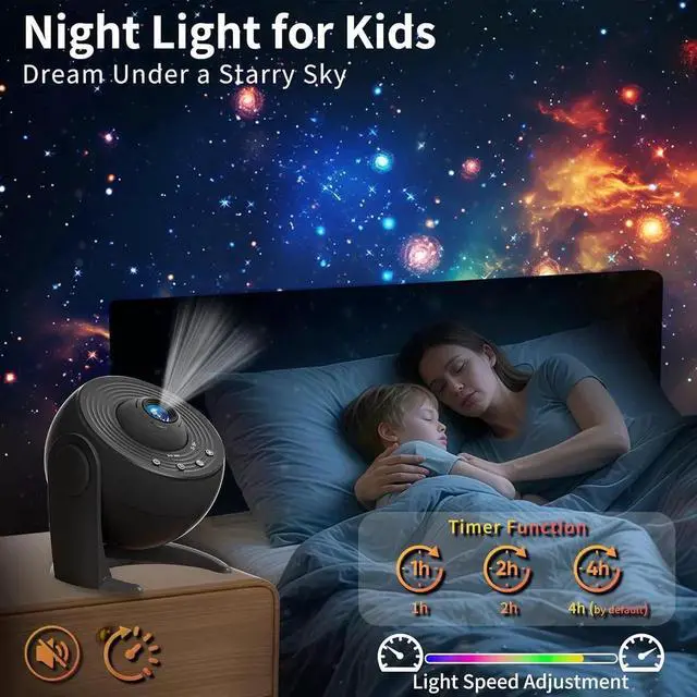 Timing Night Light for Kids &a; Rotating Starry SkyOur bedroom galaxy light projector features convenient timing functionsset it to auto-off after 1 r or 2 rs, or rely on the 4-r default auto-off to avoid forgetting to turn it off while you sleep; plus, the noiseless ceiling projector doues as bedroom ambiance light, creating a quiet, peaceful environment to help you drift off easily. It also offers adjustae rotating starry sky effects: use the button to choose from 2 rotation speeds, all mimicking the real night sky to immerse you in a ceiling full of stars.