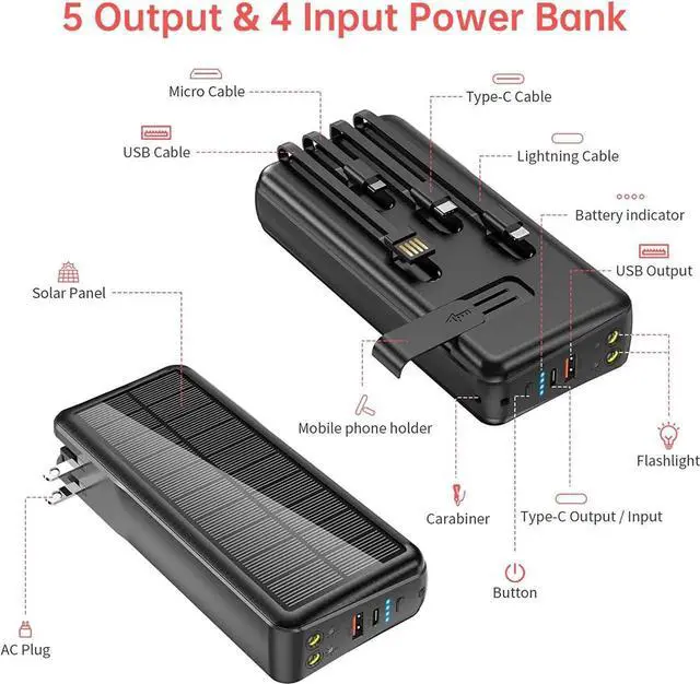 - 5 Output Ports & 4 Input PortsThe Plug In Portable Charger Come with 5 Outputs(3 Built-in Output Cables, 1 USB & 1 Type-C), with 4 Power Inputs(1 Built-in USB Cable, AC Plug, 1 Type-C & Solar Charge). Type-C Supports Input and Output. You Can Charge Up To Five Devices At Time.