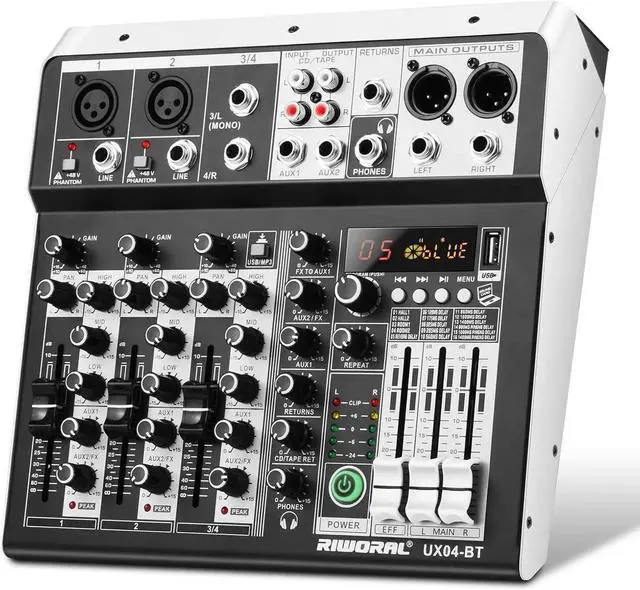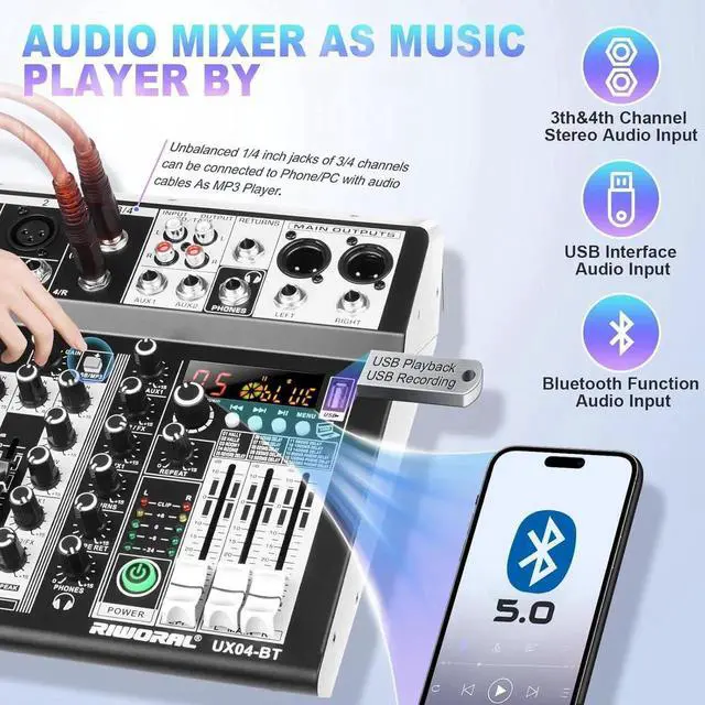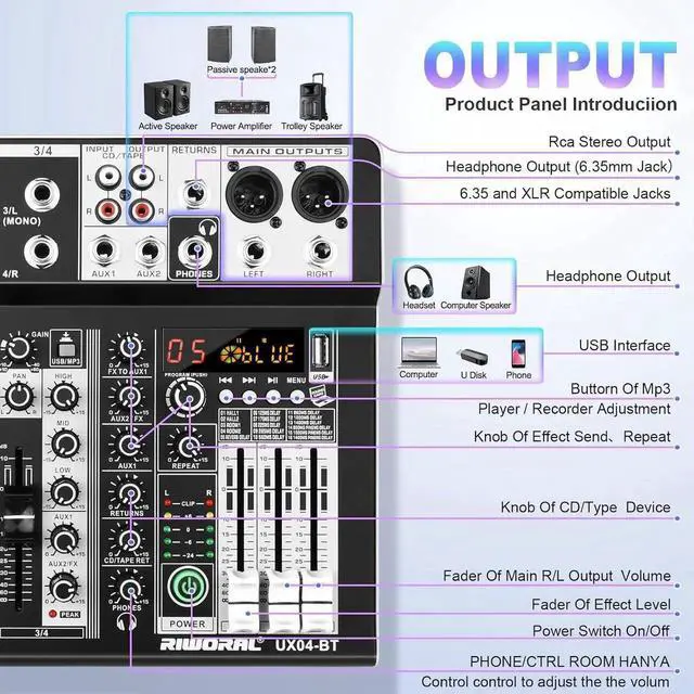 4 Channel DJ Mixer Jack Output2 AUX stereo aux returns jack, 1 pair L/R RCA output and 1 pair L/R 6.35 mm Main output to connect Active Speakers/Power Amplifier/Active Sound System/Trolley Active Speaker. In addition, also, the main output jack has 6.35 mm and XLR jacks, which can connect two sets of speakers for playback at the same time. USB music player & Bluetooth Wireless ConnectionThe USB interface can be connected to your USB stick/fast memory/MP3 to play music. DJ mixer enable to wirelessly stream music from Pad, Phone, Tablets, Computer and more bluetooth device to mix music.