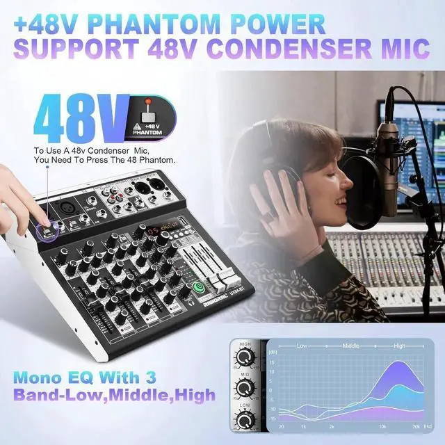 - 48V Phantom PowerThe sound mixer have 2 XLR inputs with phantom power. you can feel free to switch 48V phantom power and ultra-low noise distortion enables the audio mixer to be used with condenser microphone.