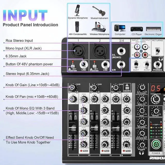 connecting different devices: Dynamic, condenser microphones, wireless microphone receivers, musical instruments etc. 3/4/ Channel L/R 6.35 mm and 1 pair L/R RCA stereo inputs to connect CD plays/keyboard/computer. 6.35 mm headphone jack, you can plug in headphones at any time to monitor the sound and volume.