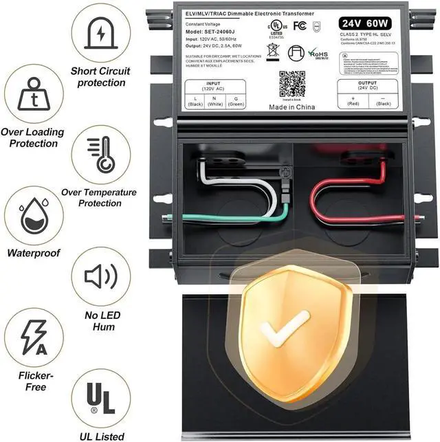 Specications: This 24v 60W led transfomer includes: UL, cUL listed, Class 2, Class P, Type HL rated. FCC compliant
